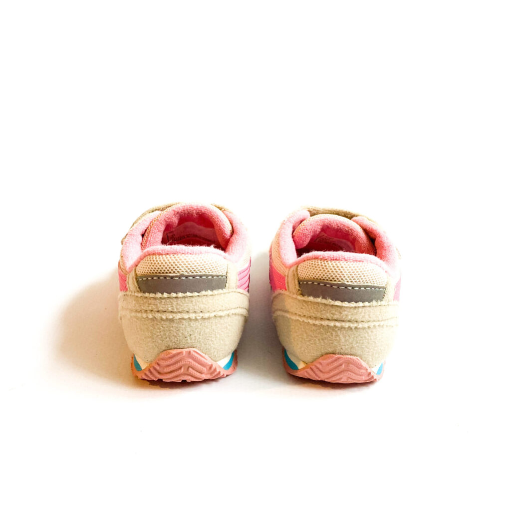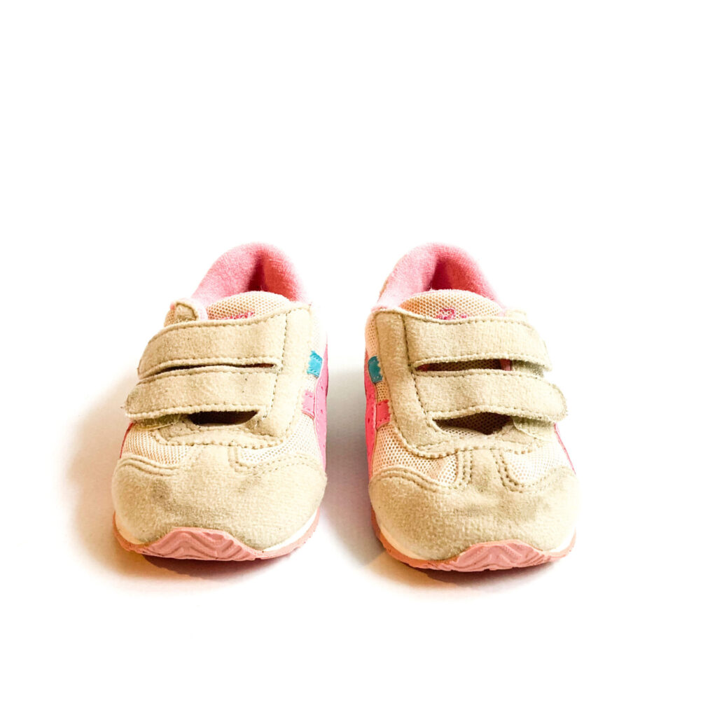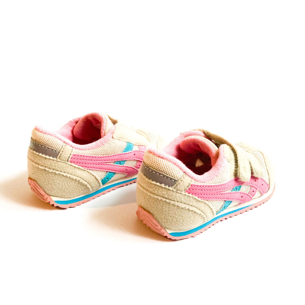 サイドのピンクの部分少しハゲあります, ベロに記名があり、シールを貼ってあります, 全体的に使用感、毛羽立ちが目立ちます。