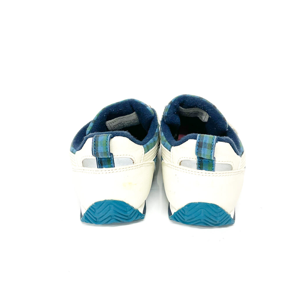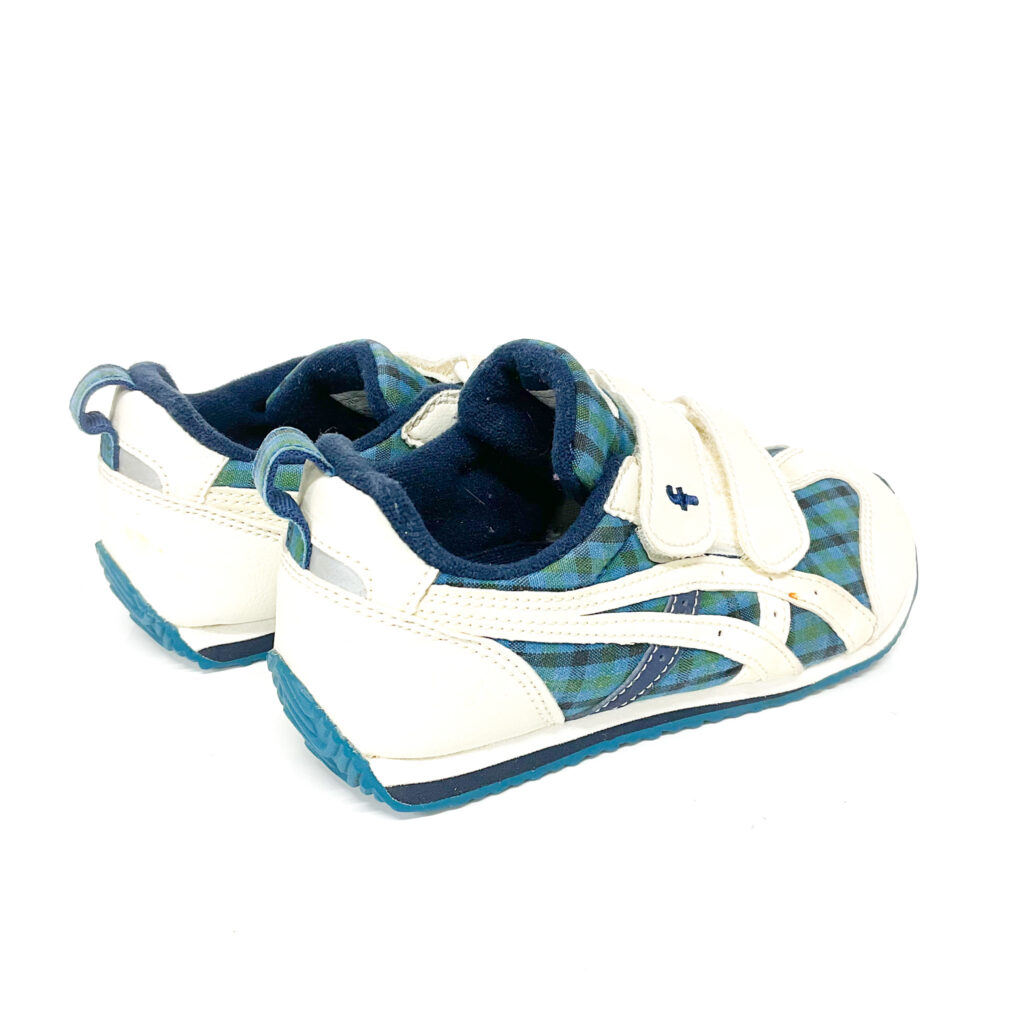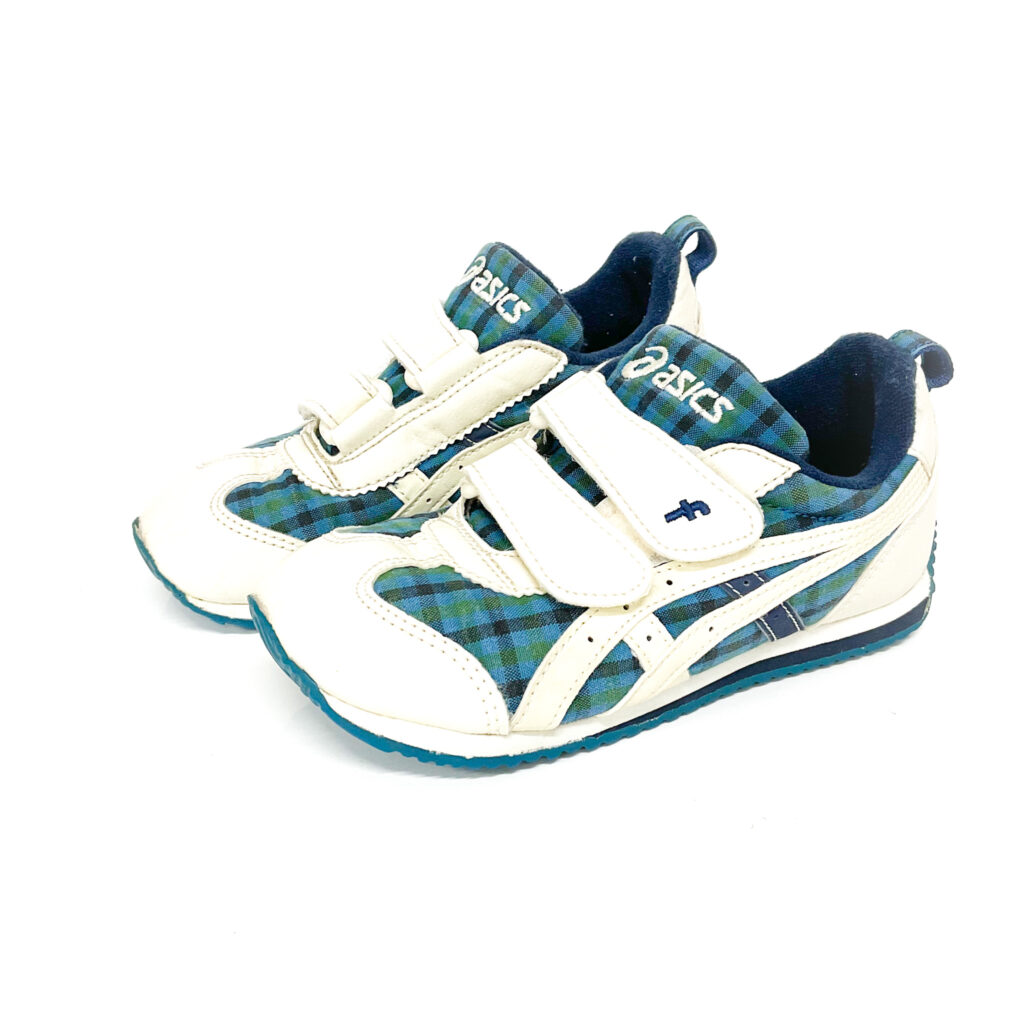 familiarとasicsのコラボモデルです, アッパー布地部分はチェック柄です。, 青と緑を感じます