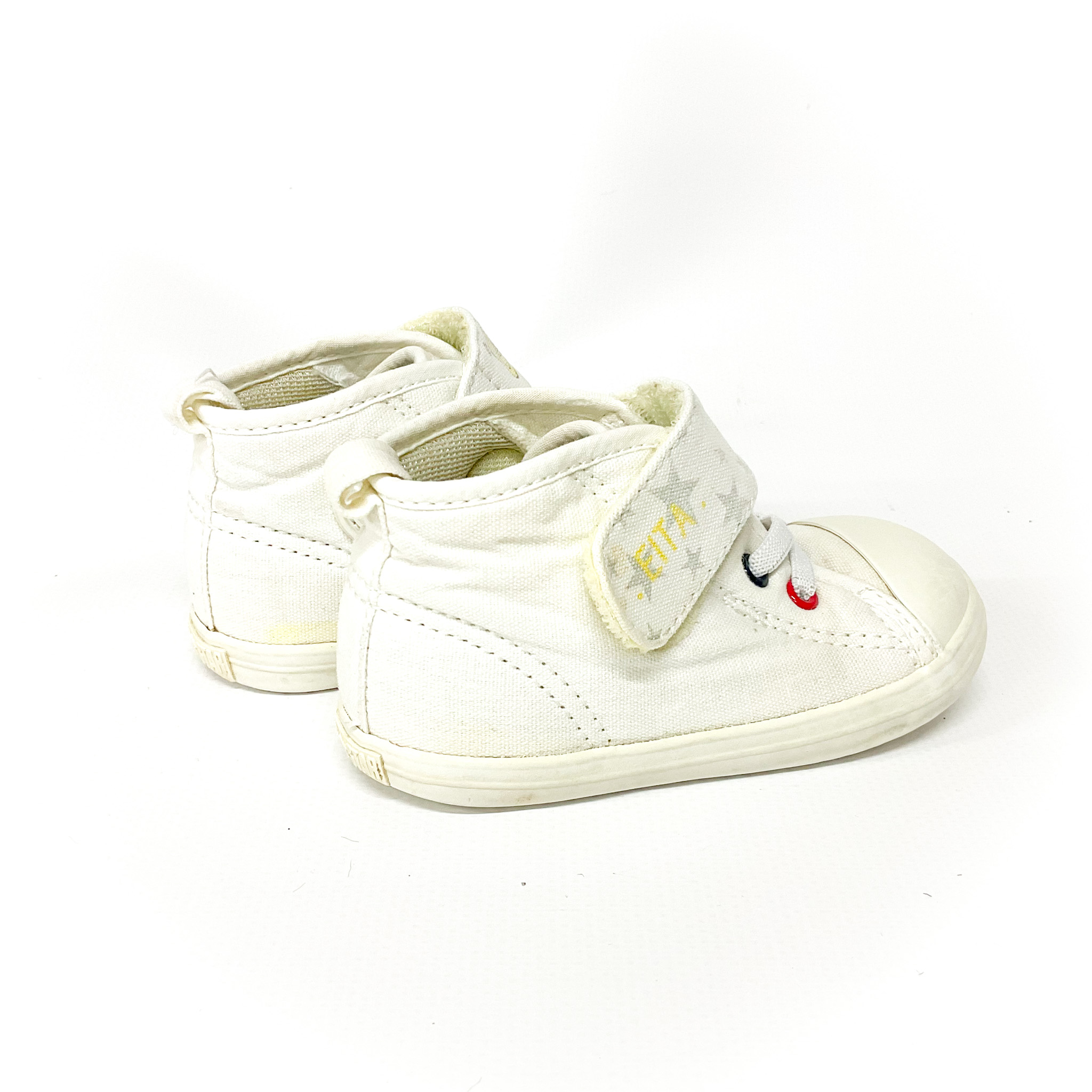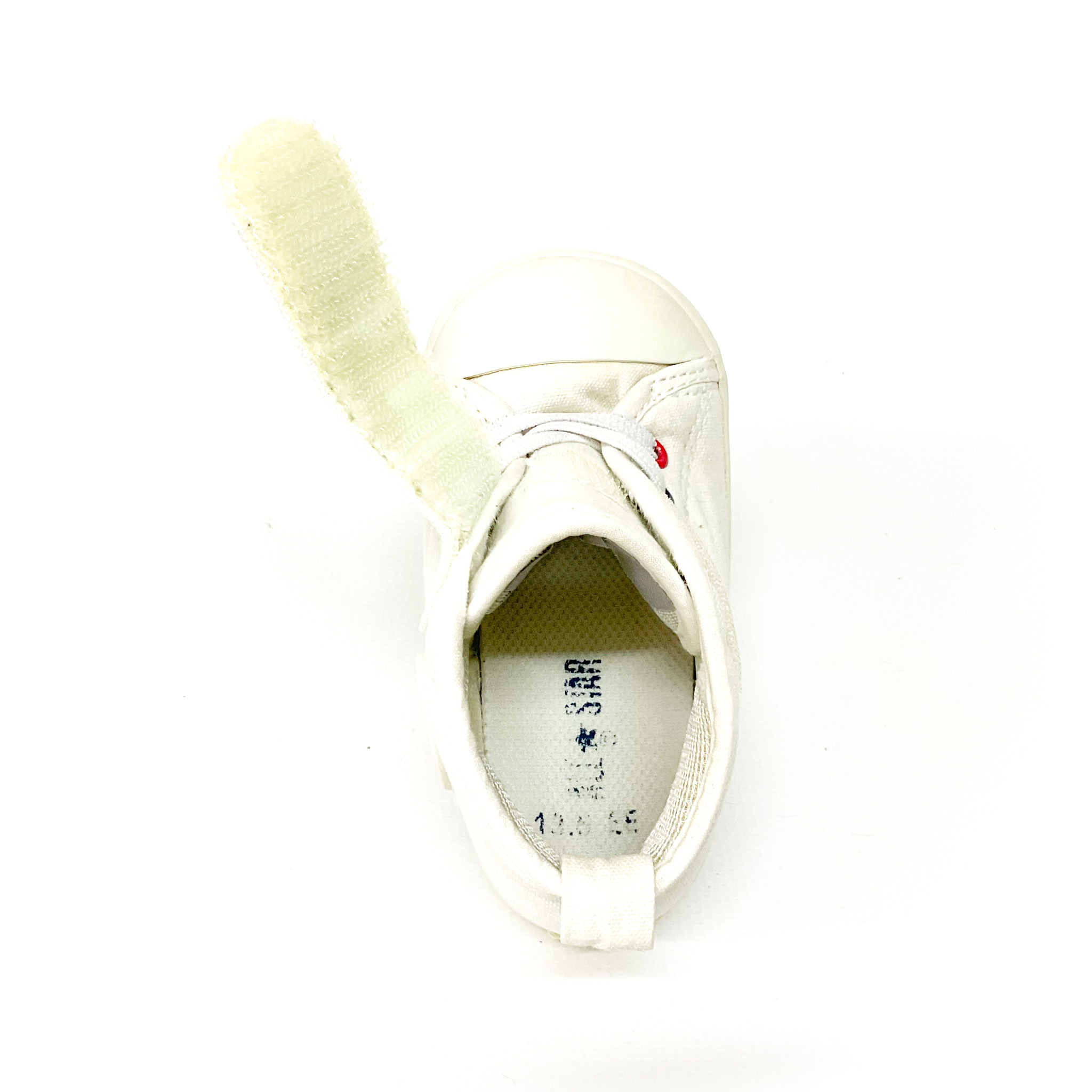 かかとに補修跡があります, ベロ裏の記名跡をシールで隠しています