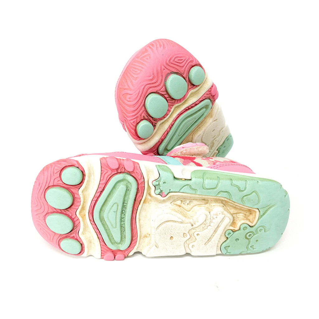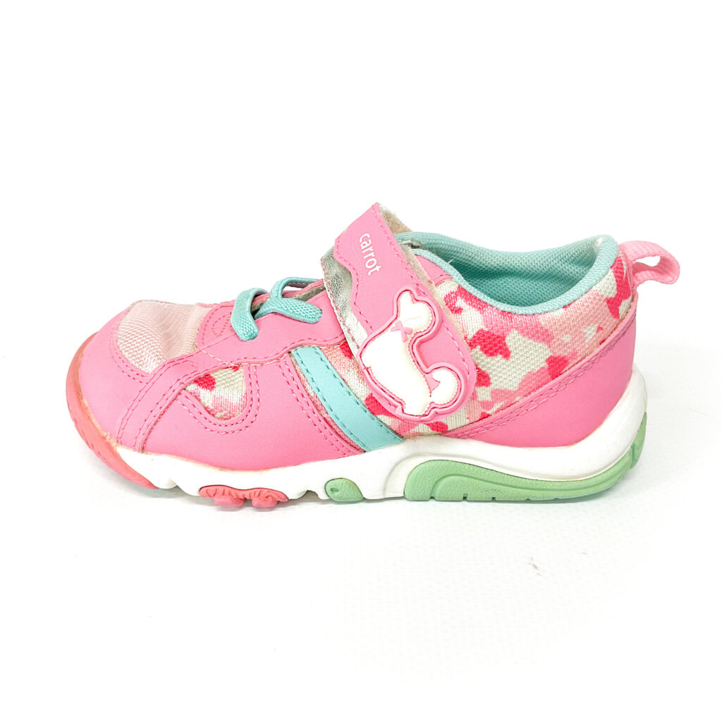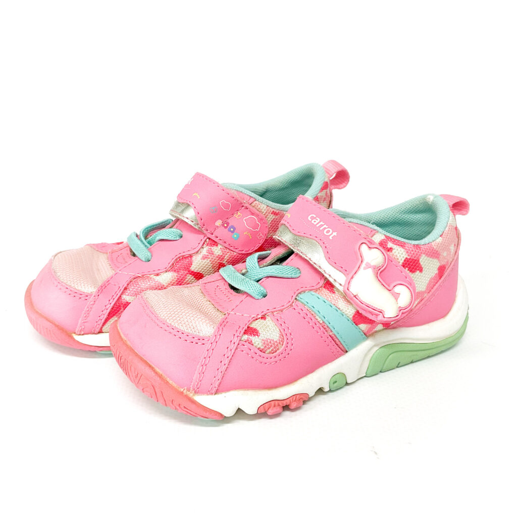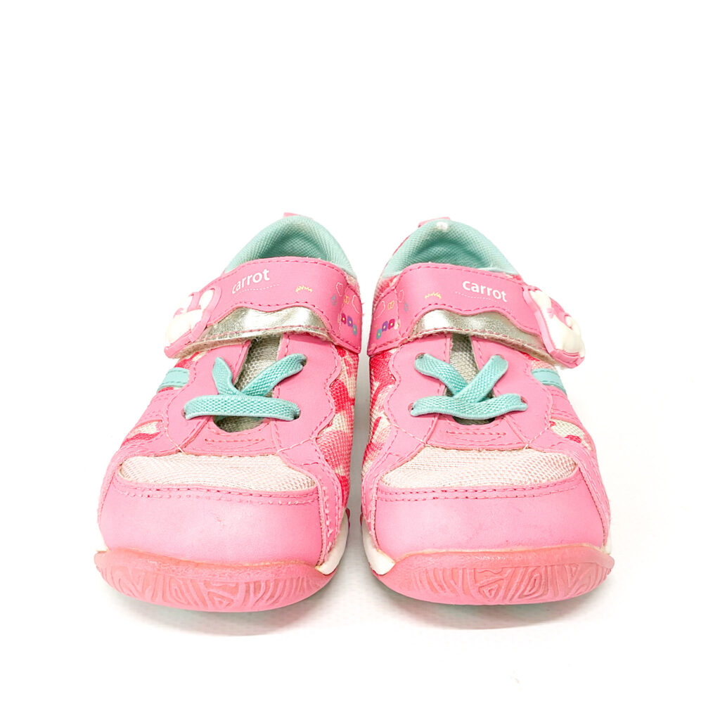 アッパーにヘタリがあります, ベルクロに猫ちゃんがついています, ベロ裏とかかとの記名跡をシールで隠しています, 履き口の内側に破れがあります