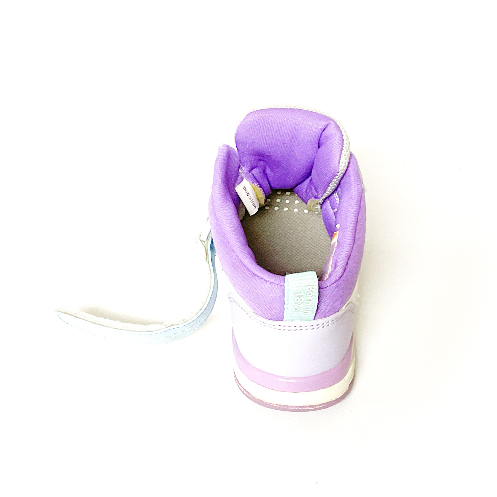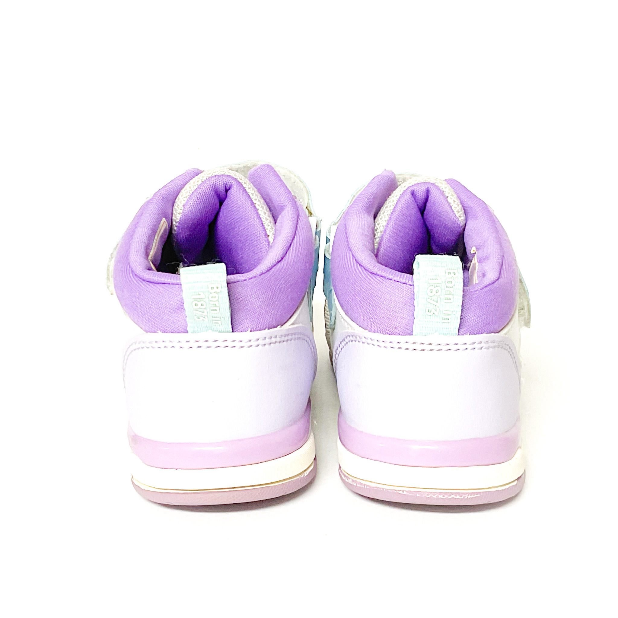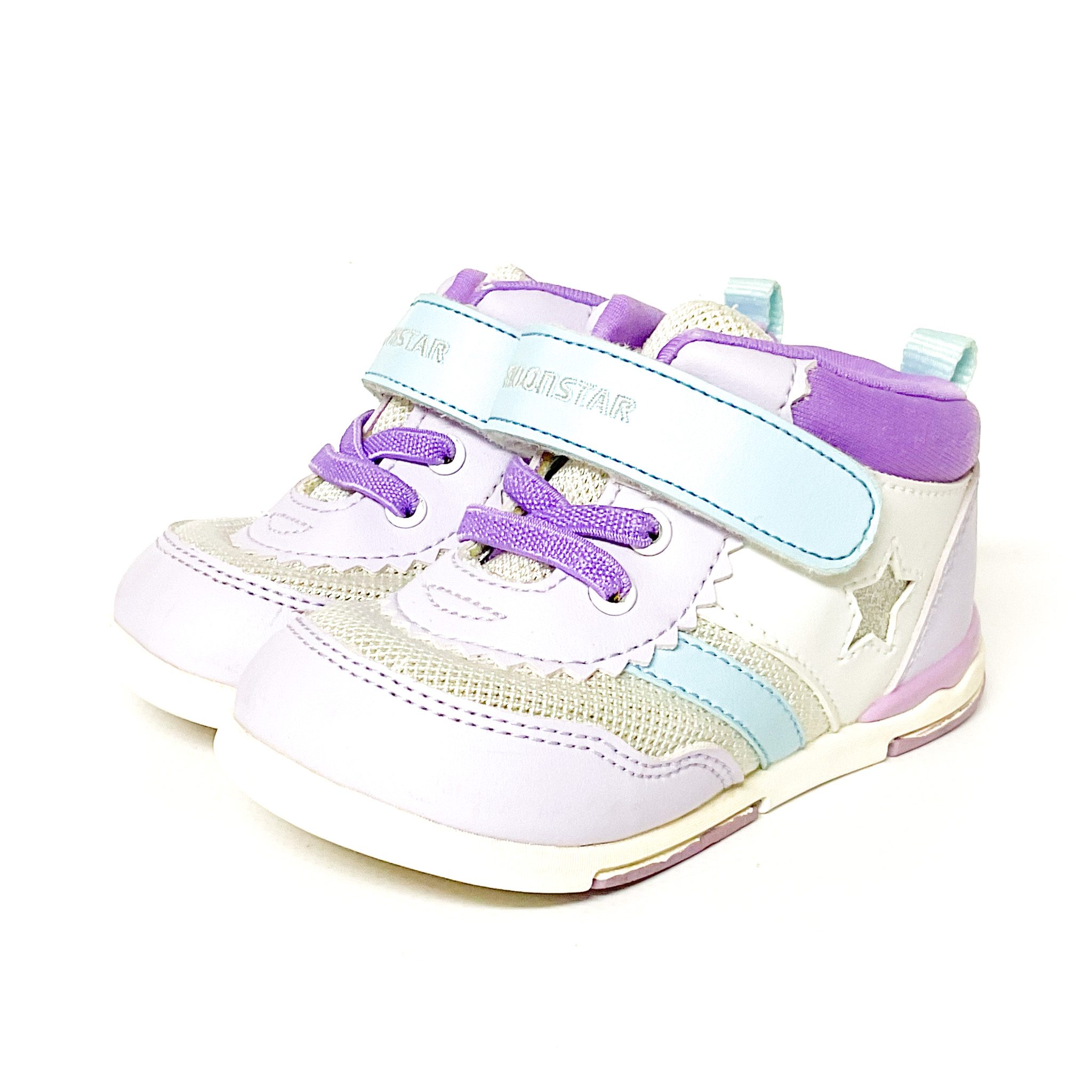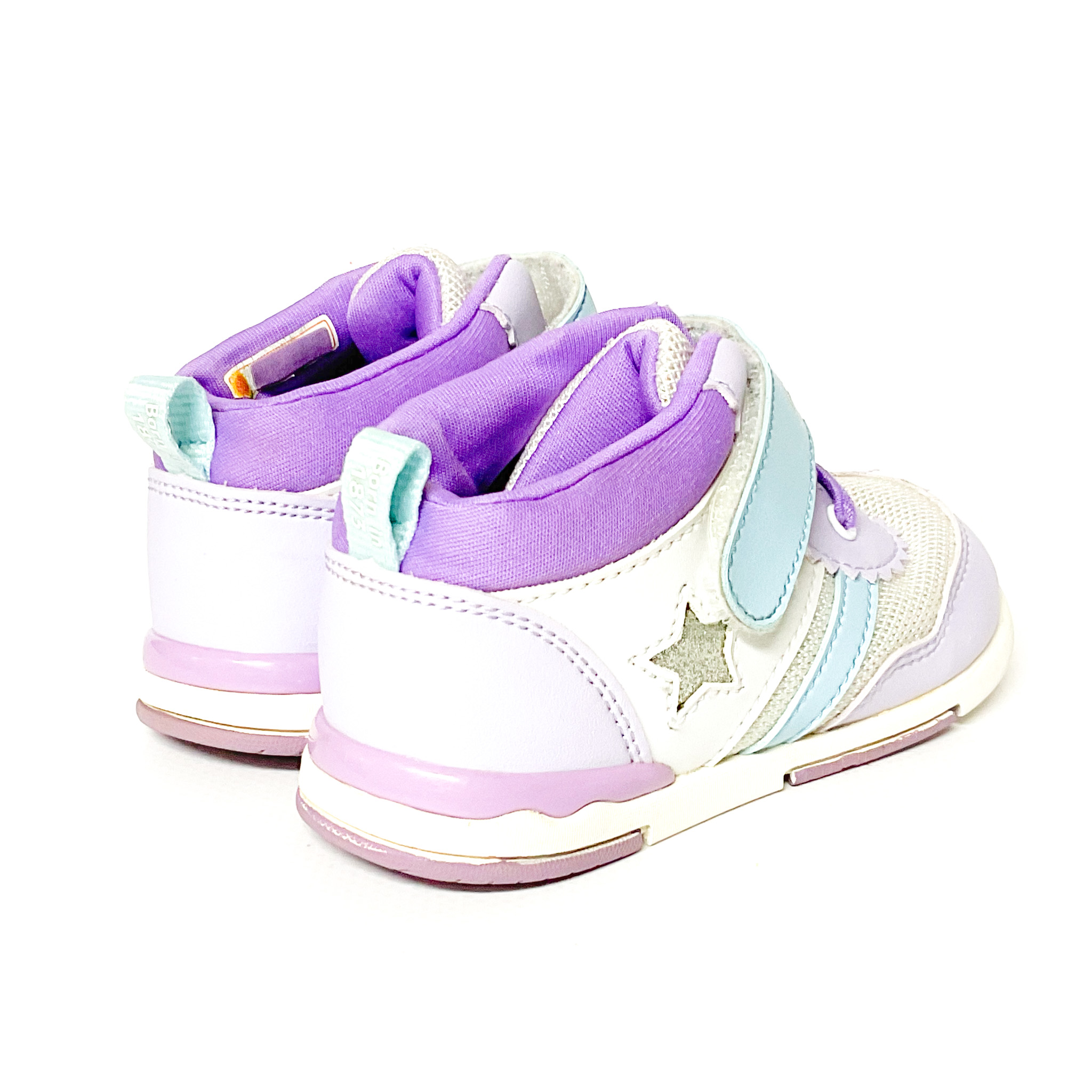 サイドにキラキラのスターがあしらわれています, 履き口の記名跡をシールで隠しています